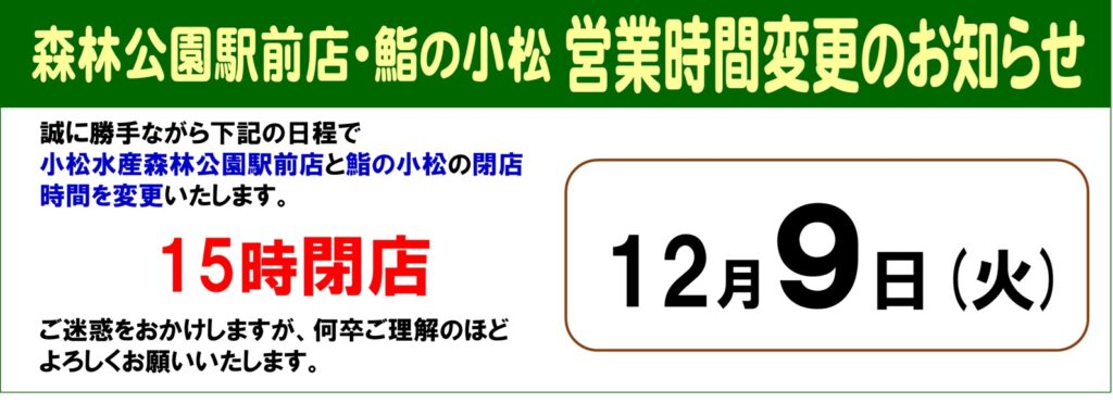 - 12月閉店時間変更(閉店時間繰上げ)のお知らせ誠に勝手ながら下記の日程で、閉店時間を20:00から15:00へ変更させていただきます。 12月9日(火) … 続きを読む: 12月閉店時間変更(閉店時間繰上げ)のお知らせ